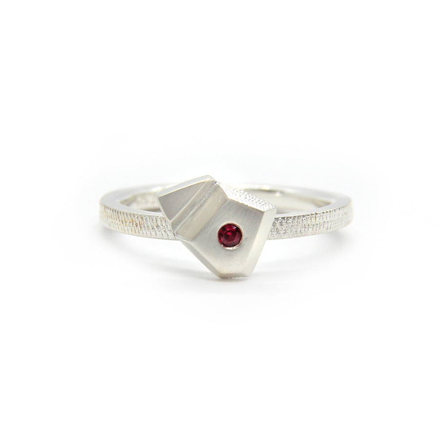 A round brilliant cut ruby (2mm) is gypsy set into faceted sterling silver. The square band is fully hand engraved.