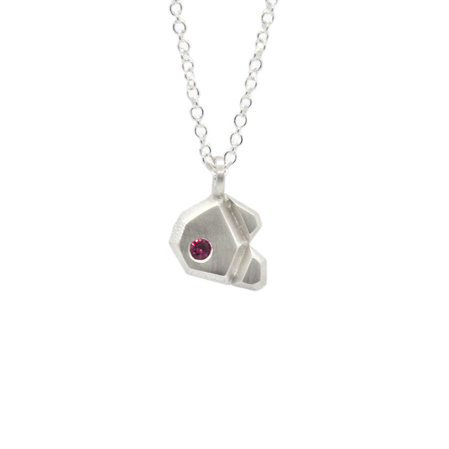 The Counterbalance Necklace features a deep red round brilliant cut ruby suspended in a sterling silver faceted pendant. This hangs from a delicate silver chain.