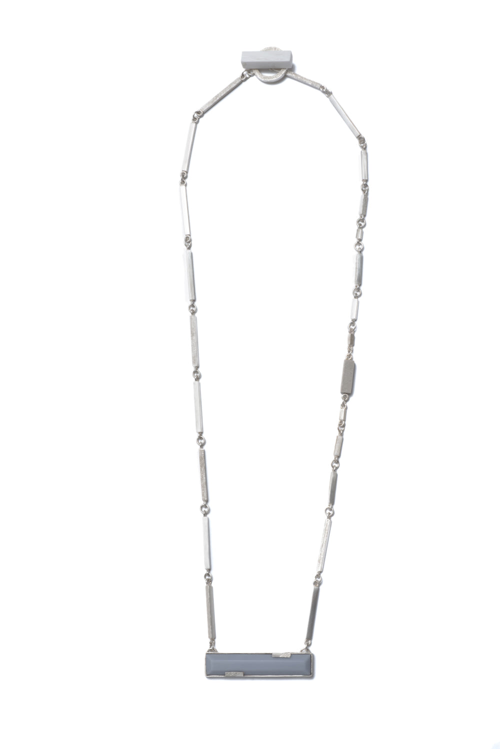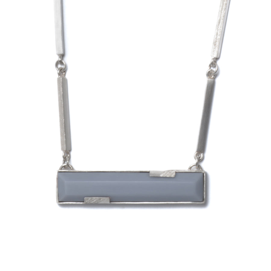 The Dash Necklace features a faceted Corian pendant set in sterling silver on a handmade asymmetrical long linked chain. A toggle clasp rounds out this chain, all of which features painstakingly hand engraved texture.