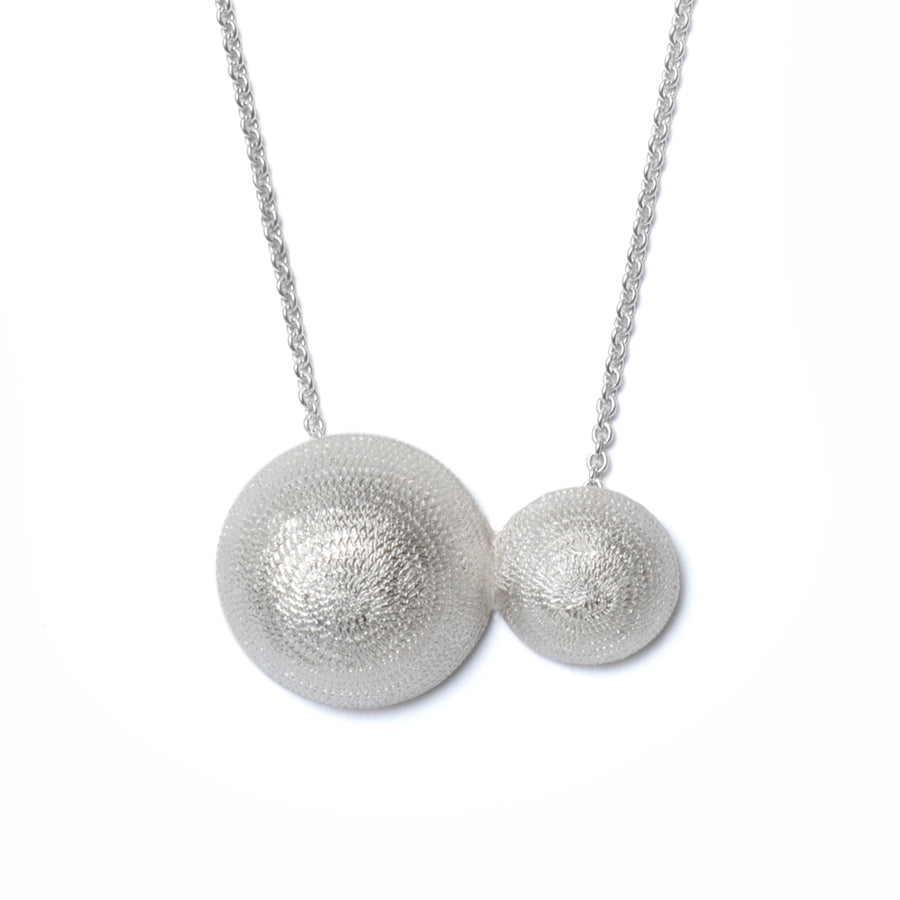 The Dot necklace features two sterling silver domes nestled together on a silver chain. They are painstakingly hand engraved in Lauren's signature texture.