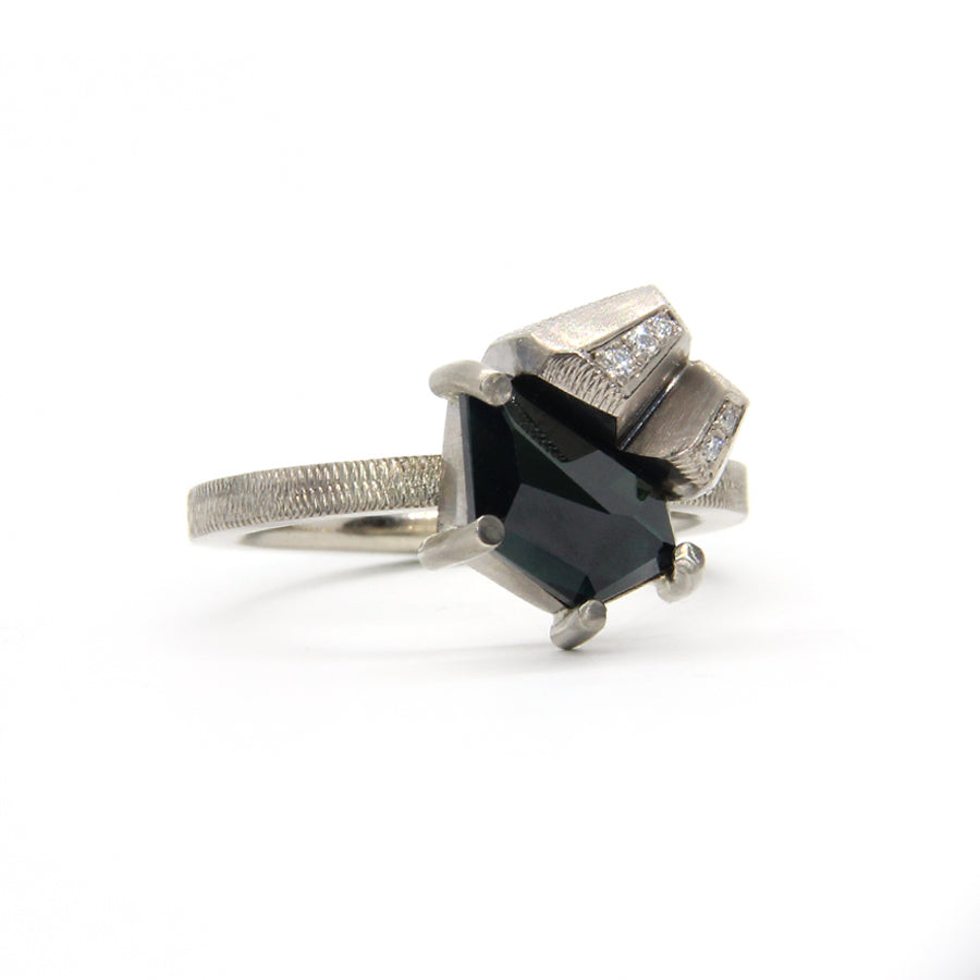 A 10x5.5mm deep blue/green freeform cut Australian parti sapphire is claw set into 18ct white gold. It is accented by angular clusters of gold scattered with round white diamonds FG Si2.