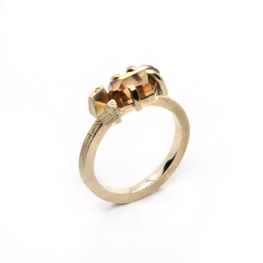 The Galeras Ring features a honey-toned 2.34ct freeform faceted Australian Zircon from Harts Range, Northern Territory. It sits alongside 2 round white diamonds set into a faceted chunk of 9ct yellow gold. The square profile band is fully hand engraved.