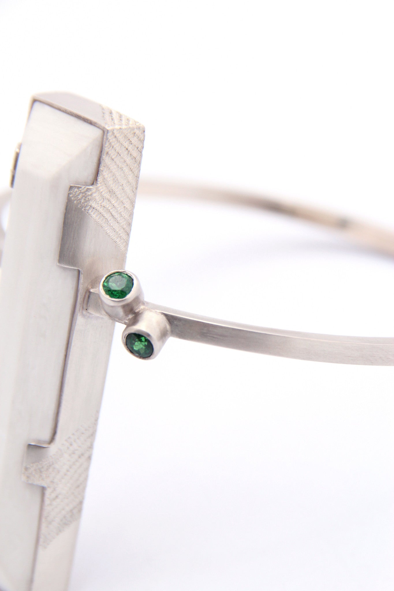 The Glacier bracelet features a hand carved corian slice in sterling silver, offset by two vivid green Tsavorite garnets.