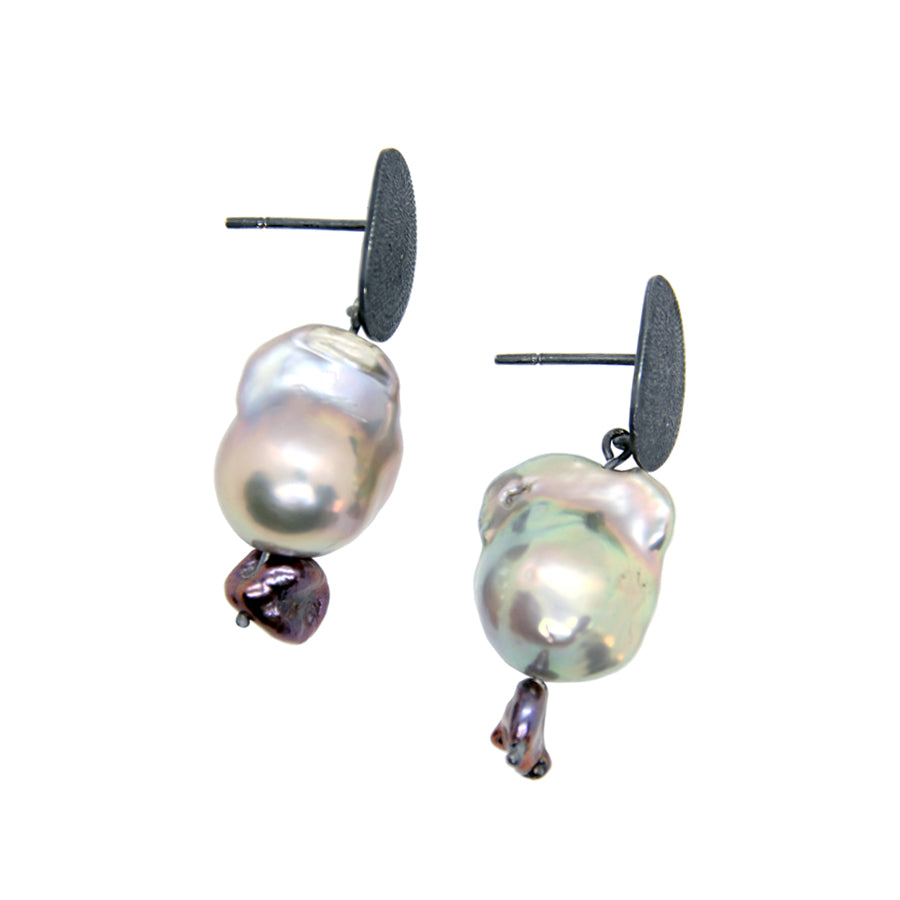 These earrings feature the most spectacular grey freshwater baroque pearls accompanied by small keshi pearls at the base. The moody colour palette is offset by the hand engraved oxidised sterling silver studs.