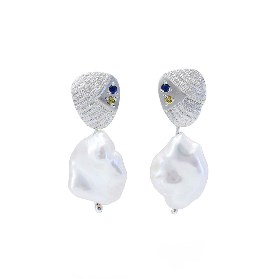 The Island Earrings feature layers of hand engraved sterling silver dotted with round brilliant cut ceylon blue and yellow sapphires. Lustrous baroque freshwater pearls hang from the silver studs and articulate with the wearer's movement.