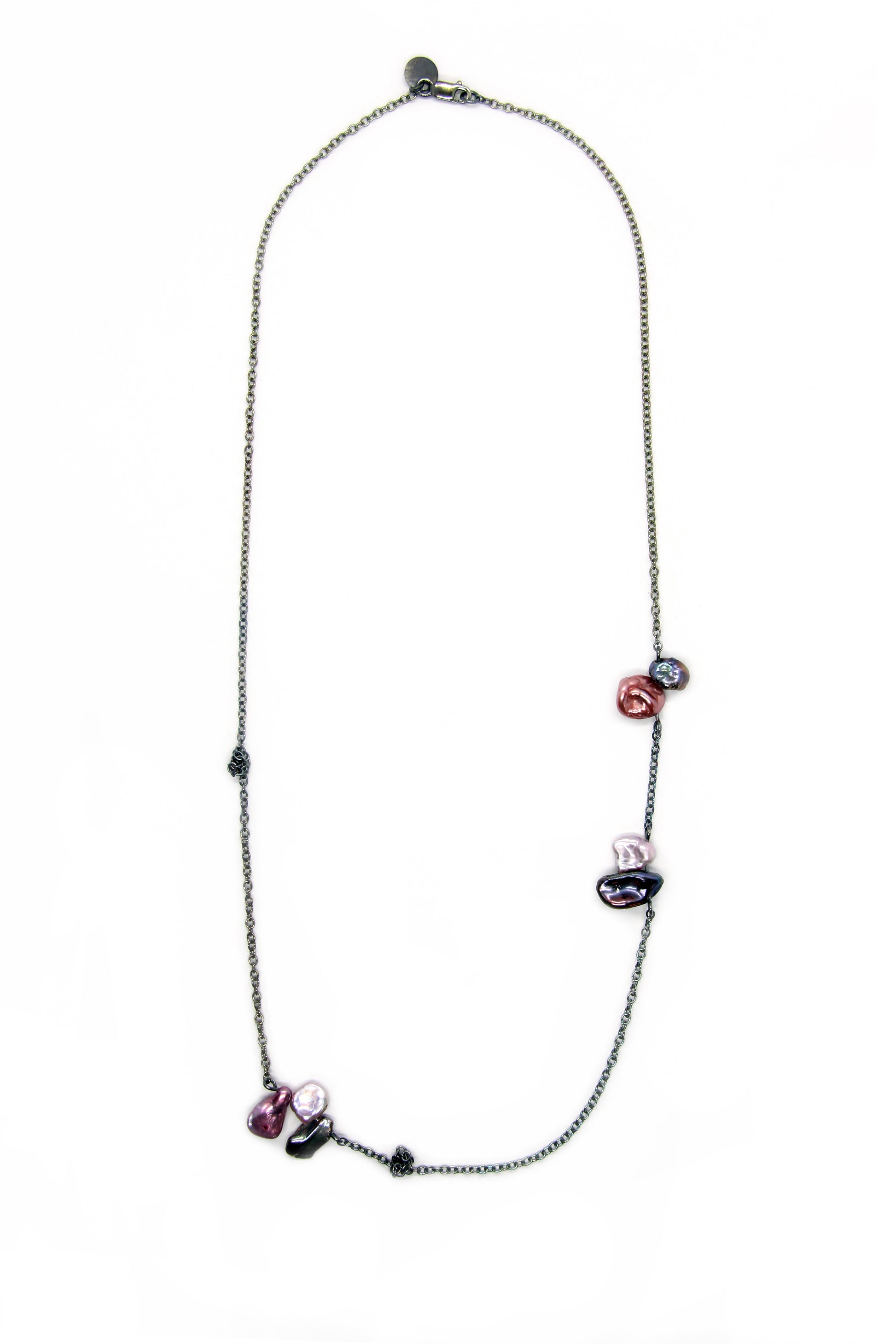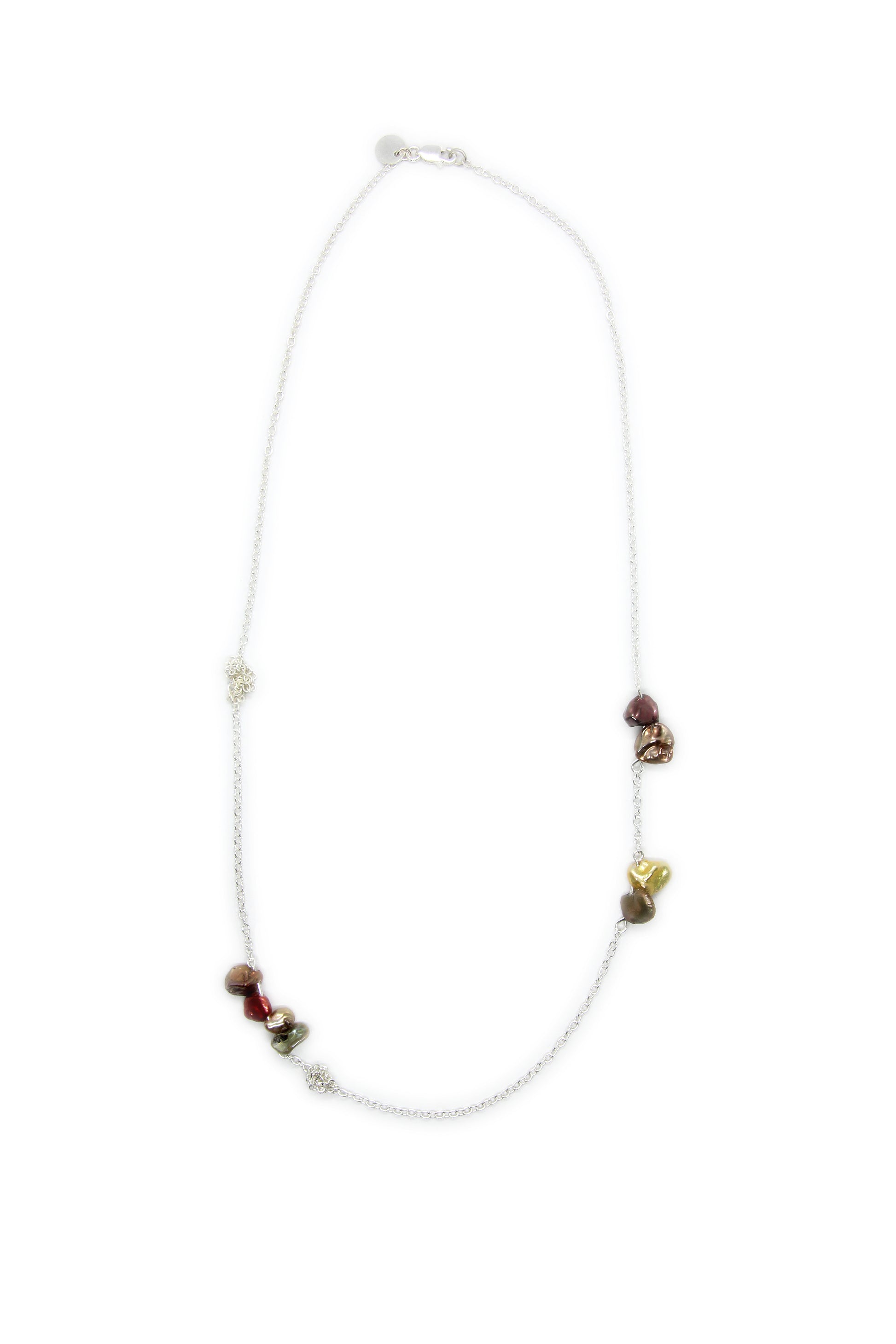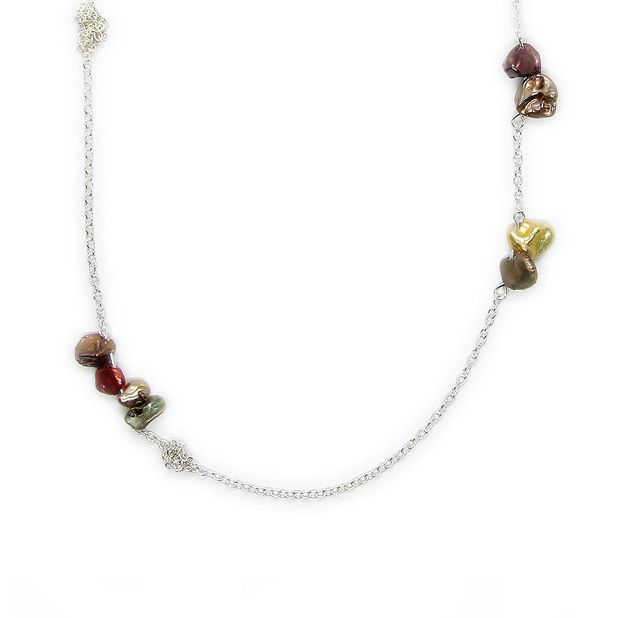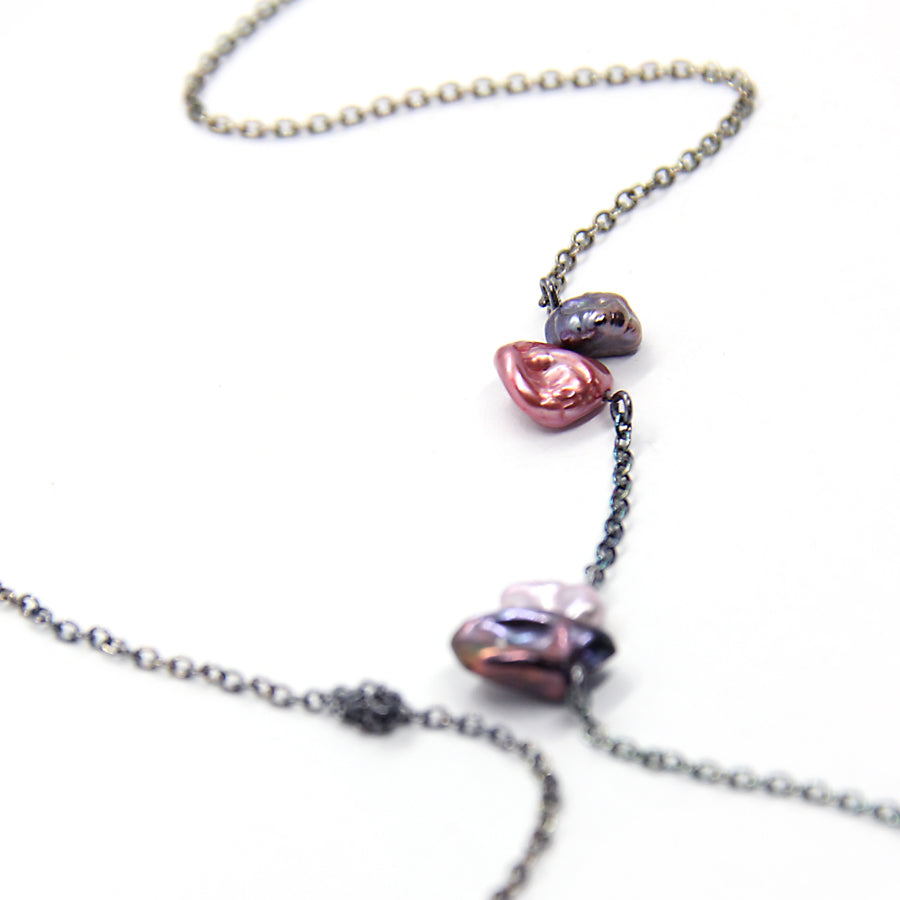 A delicate and unconventional pearl neckpiece. Beautiful, vibrant keshi pearls are dotted along a silver trace chain, with intermittent knots woven in between. Available in two colours: sterling silver and golden tones (deep reds, yellows and earthy greens), or oxidised silver and pink tones (punchy pinks, purples and lustrous whites).