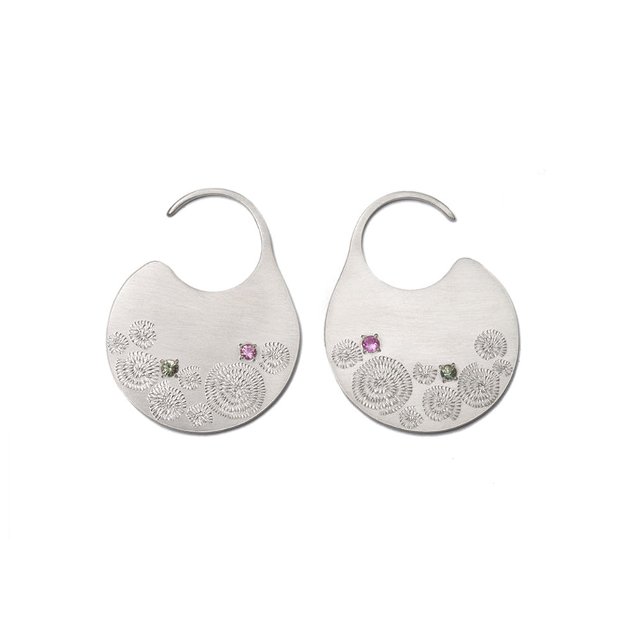The Full Turn Earrings are dotted with round brilliant cut pastel pink and green sapphires. Hand engraved spirals feature on both the front and back. The earrings are shipped with rubber earring stoppers to ensure ease of wear.