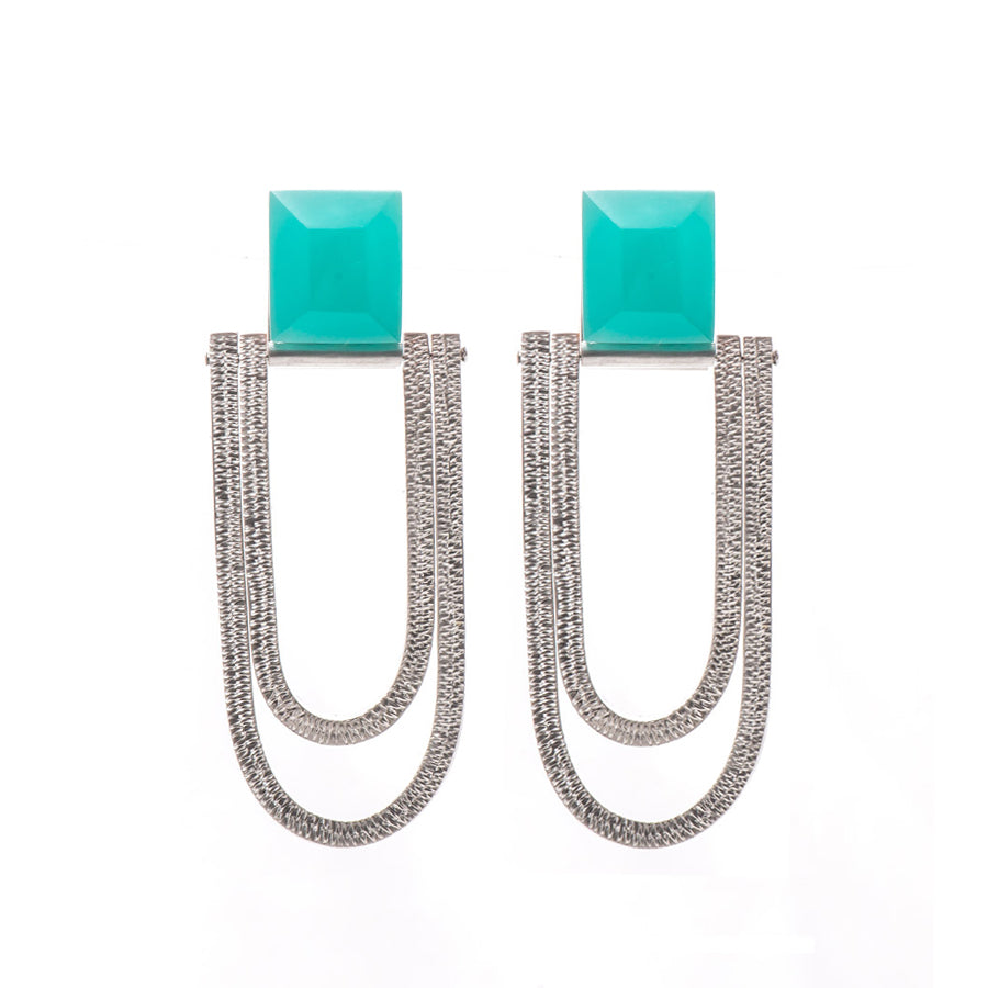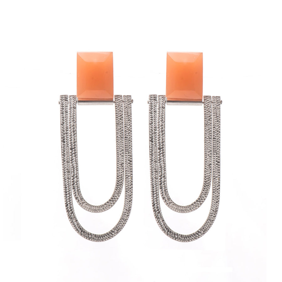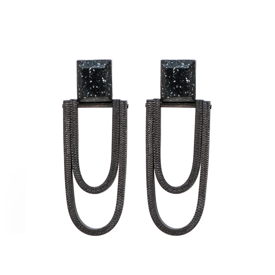 These U-shaped engraved sterling silver earrings feature a slice of faceted corian. They are available in a number of corian colours including bright translucent tangerine, teal, marbled white and black Corian. The silver components swing with the wearer's movement.
