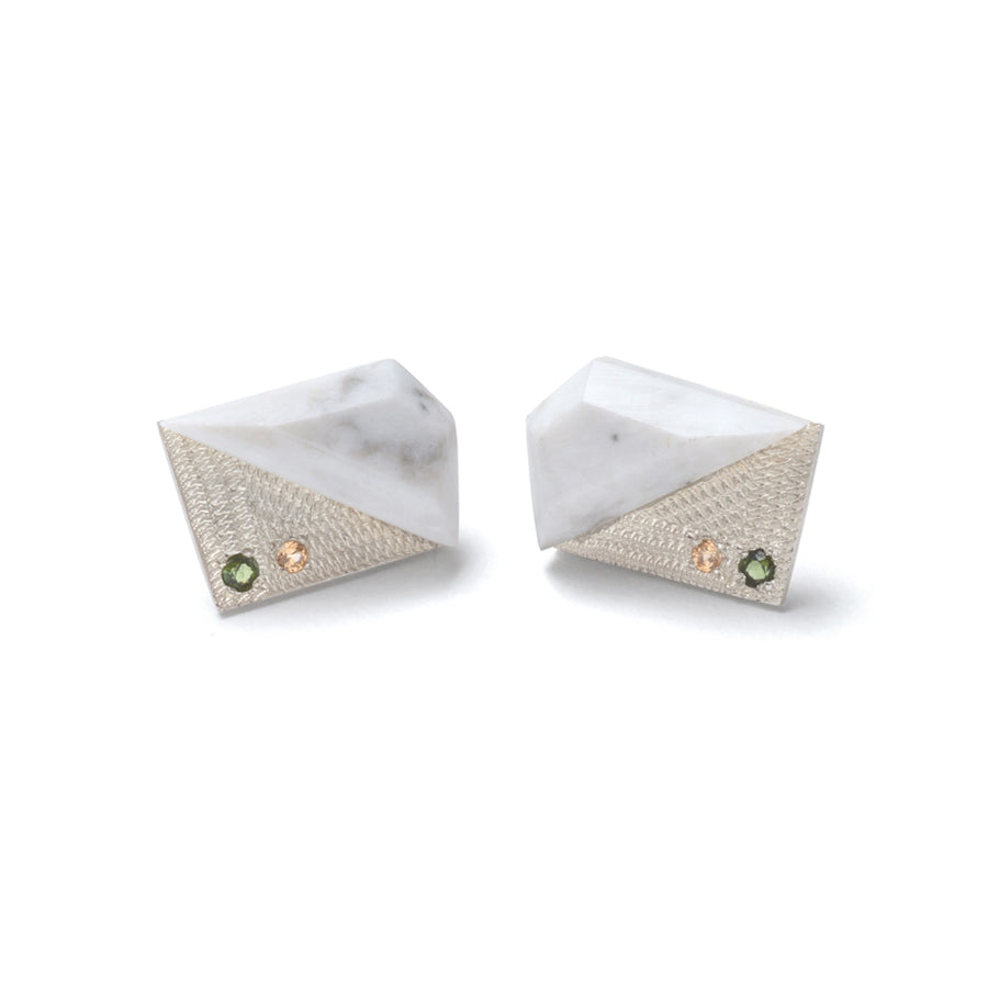 The geometric Spring studs come in two different colours. Gemstones have been carefully selected and set into hand engraved sterling silver to compliment the subtle hints of colour in the Corian.