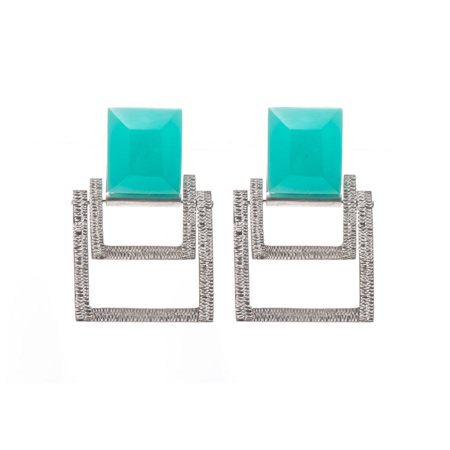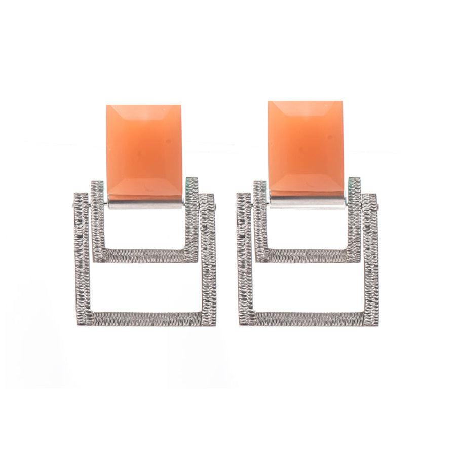 Engraved sterling silver and Corian earrings. The silver components sway freely with the wearer's movement. Available in a number of corian colours including bright translucent tangerine, teal, marbled white and black (with oxidised silver).