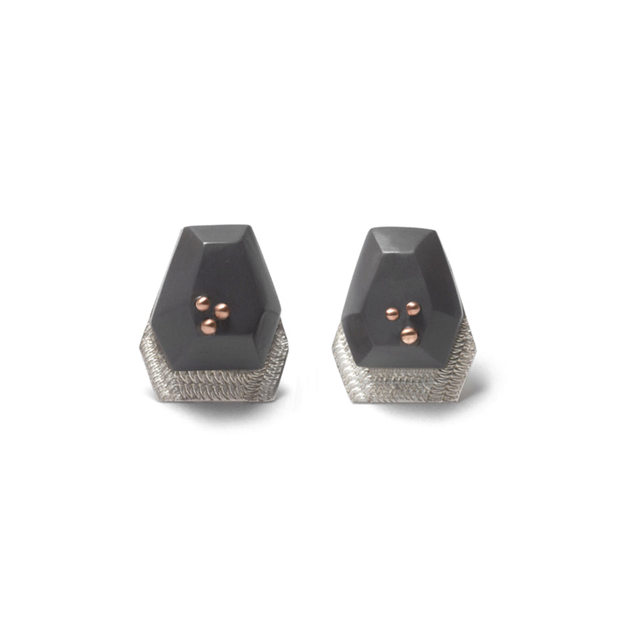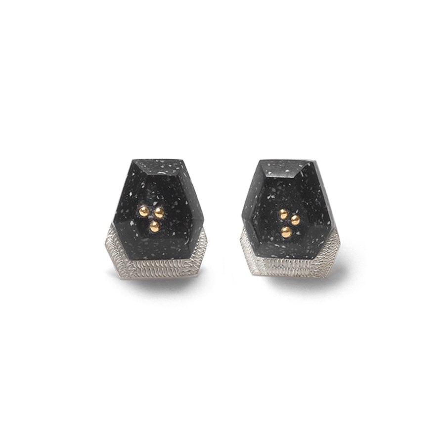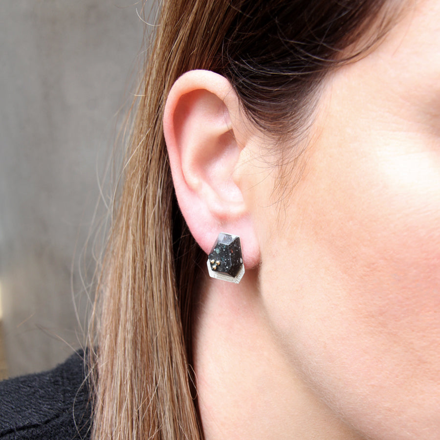 This pair of sterling silver stud earrings feature gold granules embedded into hand carved pieces of corian. These are framed by contrasting engraved sterling silver. They are available in two different colour combinations: Grey corian with 9ct rose gold granules, or black corian with 9ct yellow gold granules.