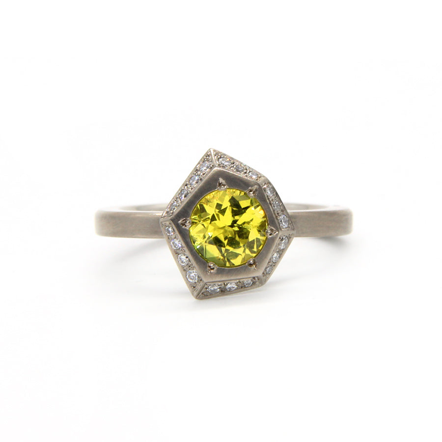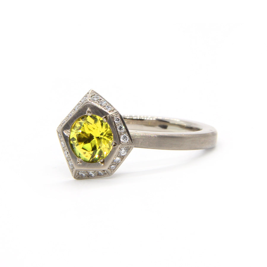 A punchy 1.14ct (6.1mm) round brilliant cut yellow Australian sapphire is grain set into the face of an angular freeform shape. A halo of graduating round brilliant cut white diamonds FG Si2 form the perfect frame. Made in 18ct white gold.